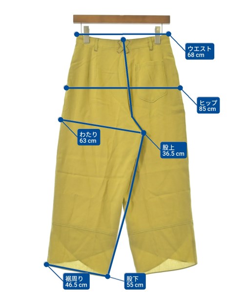 [Brand] Jocomomola [Type] Women's [Condition] Rank: B Details: Fluffing [Color] Yellowish green [Size] 40 (M) [Actual size] Waist:68cm Hem circumference: 46.5cm Hip:85cm Crossing:63cm Rise: 36.5cm Inseam: 55cm Material: 47% rayon, 37% polyester, 16% nylon, (lining) polyester (as per quality label) [Country of origin] China [Other details] Season: Spring-Summer Pockets: Yes External pockets: 3 Translucency: None Fabric thickness: normal Lining: Yes Elasticity: None Gloss: None Opening and closing: zipper |