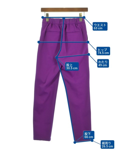 [Brand] BARNYARDSTORM [Type] Women's [Condition] Rank: A [Color] Purple [Size] 0 (S size) [Actual size] Waist:63cm Hem circumference: 26.5cm Hip:74.5cm Crossing:49cm Rise: 30.5cm Inseam: 66cm Material: 78% nylon, 22% polyurethane, (back) 96% polyester, 4% polyurethane [Comment] The waist is adjustable with elastic. [Other details] Season: Spring-Summer Pockets: Yes Outside Pockets: 4 Translucency: None Fabric thickness: normal Lining: None Elasticity: Yes Gloss: None Opening and closing: zipper |