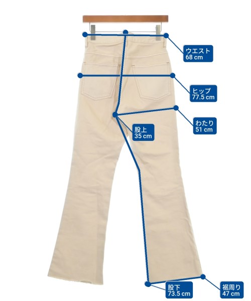 [Brand] SHENERY [Type] Women's [Condition] Rank: A [Color] Beige (denim) [Size] 38 (Medium) [Actual size] Waist:68cm Hem circumference: 47cm Hip:77.5cm Crossing:51cm Rise: 35cm Inseam:73.5cm [Material] 100% cotton [Country of origin] Japan [Other details] Season: All season Pockets: Yes Outside Pockets: 4 Translucency: None Fabric thickness: normal Lining: None Elasticity: None Gloss: None Opening and closing: zipper |
