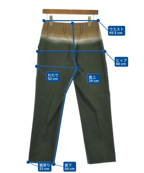 [Brand] PRADA [Type] Women's [Condition] Rank: B [Color] Green, etc. [Size] 38 (S size) [Actual size] Waist: 69.5cm Hem circumference: 33cm Hip:86cm Crossing:53cm Rise:29cm Inseam: 64cm [Material] 100% cotton [Country of origin] Italy [Other details] Season: Spring-Summer Pockets: Yes Outside Pockets: 4 Translucency: None Fabric thickness: normal Lining: None Elasticity: None Gloss: None Opening and closing: zipper |