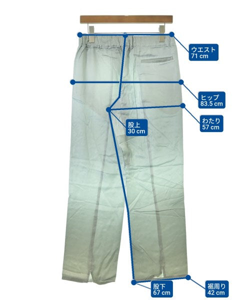 [Brand] OVERCOAT [Type] Women's [Condition] Rank: A [Color] Light blue [Size] 00 (Medium) [Actual size] Waist:71cm Hem circumference: 42cm Hip:83.5cm Crossing:57cm Rise: 30cm Inseam:67cm [Material] (Outer) 54% rayon, 46% cupra [Country of origin] Japan [Comments] The waist can be adjusted using elastic or a drawstring. [Other details] Season: Spring-Summer Pockets: Yes External pockets: 3 Translucency: None Fabric thickness: normal Lining: None Elasticity: None Gloss: Yes Opening and closing: None |